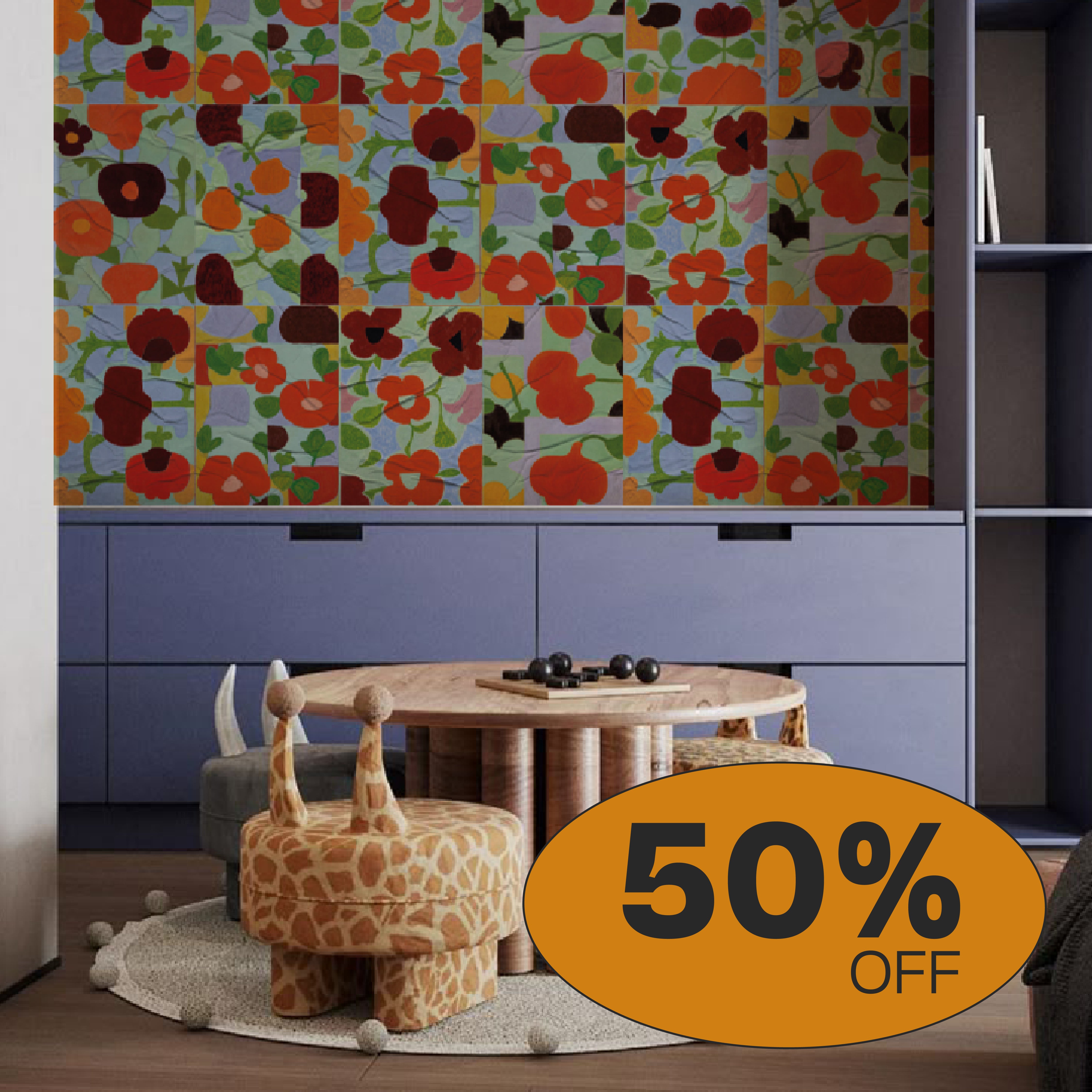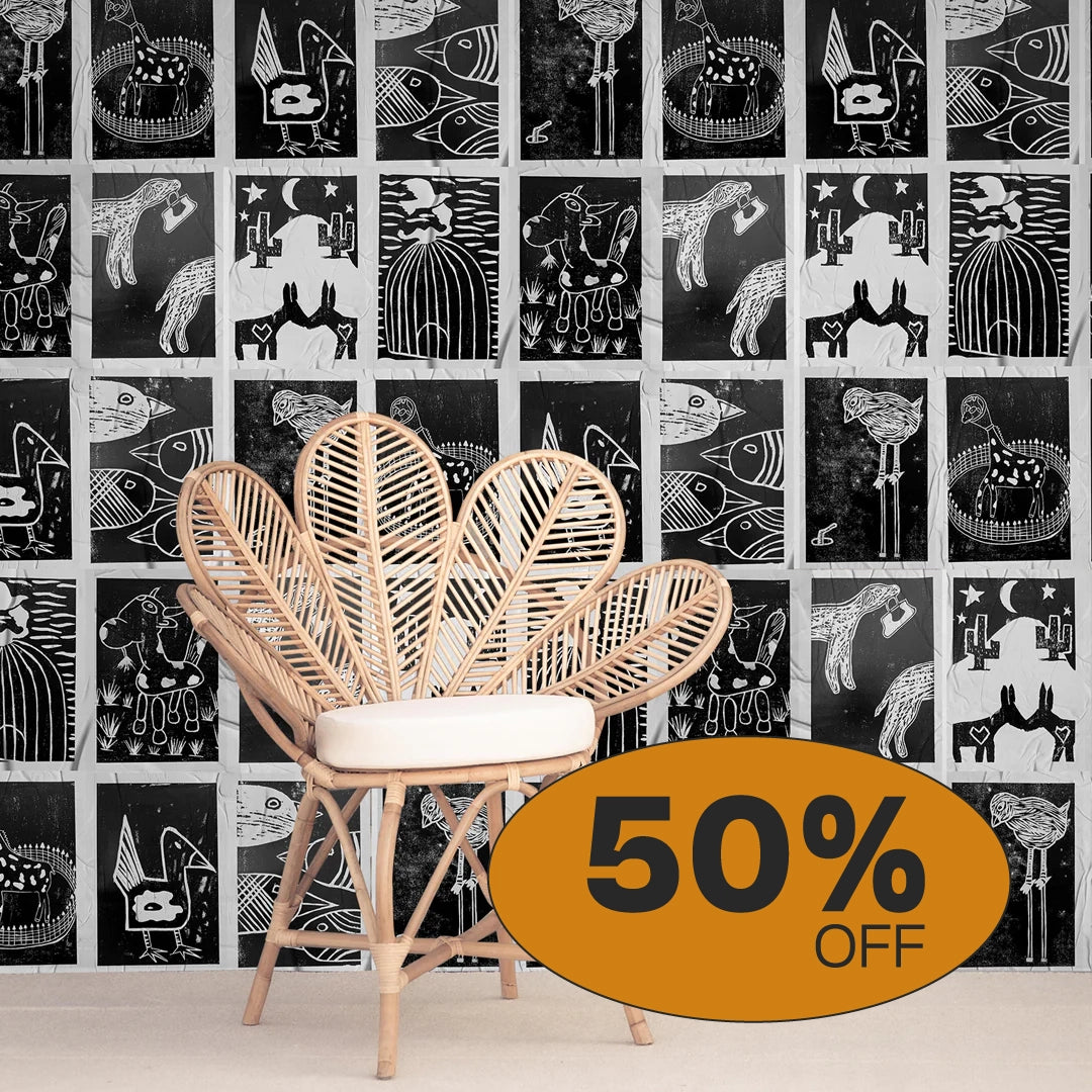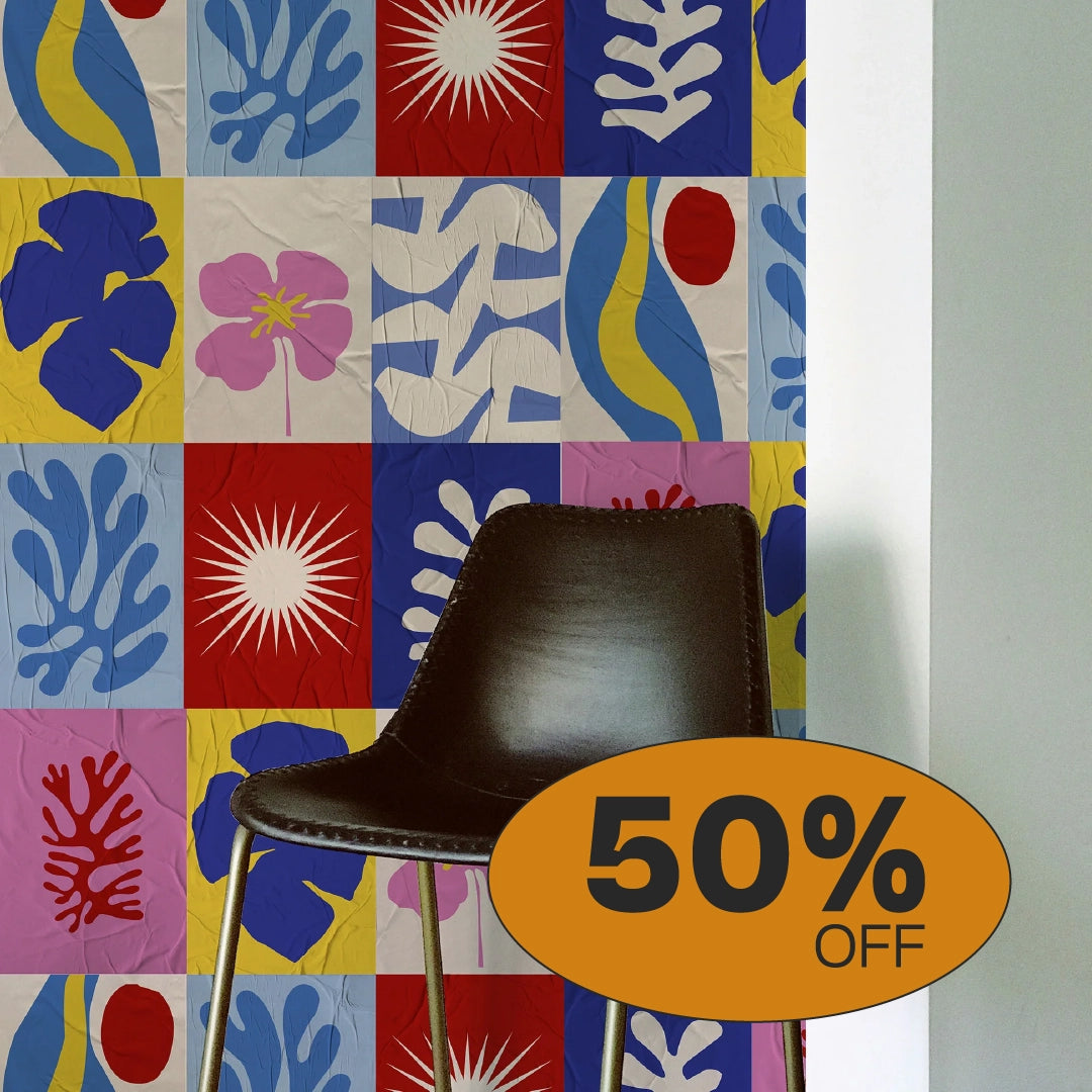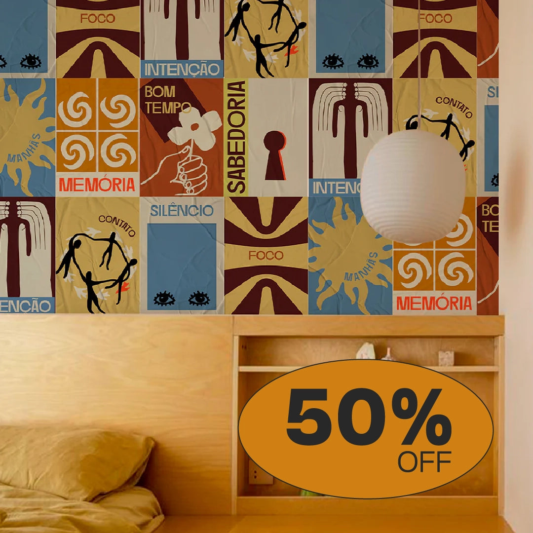 A aplicação é simples: cola branca, um rolinho e um paninho — e pronto. Você cobre até 5 m² de parede e cria desde uma composição inteira até pequenos blocos visuais. O lambe-lambe permite experimentação total: misture coleções, mude de lugar, conte histórias e deixe o ambiente com a sua cara.