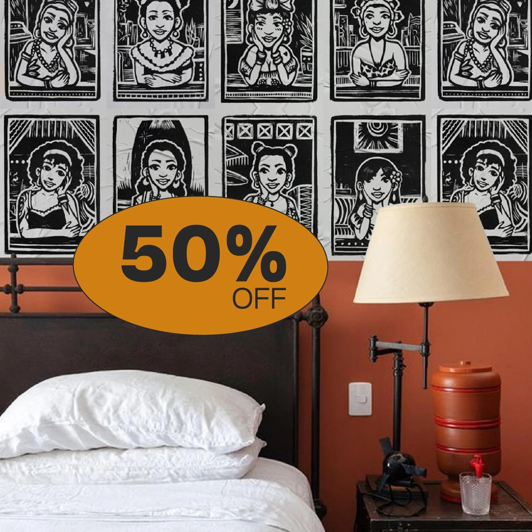 A aplicação é simples: cola branca, um rolinho e um paninho — e pronto. Você cobre até 5 m² de parede e cria desde uma composição inteira até pequenos blocos visuais. O lambe-lambe permite experimentação total: misture coleções, mude de lugar, conte histórias e deixe o ambiente com a sua cara.